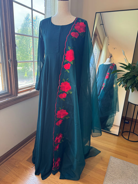 Peacock Green Faux Georgette Double flair Anarkali Gown with Organza Dupatta