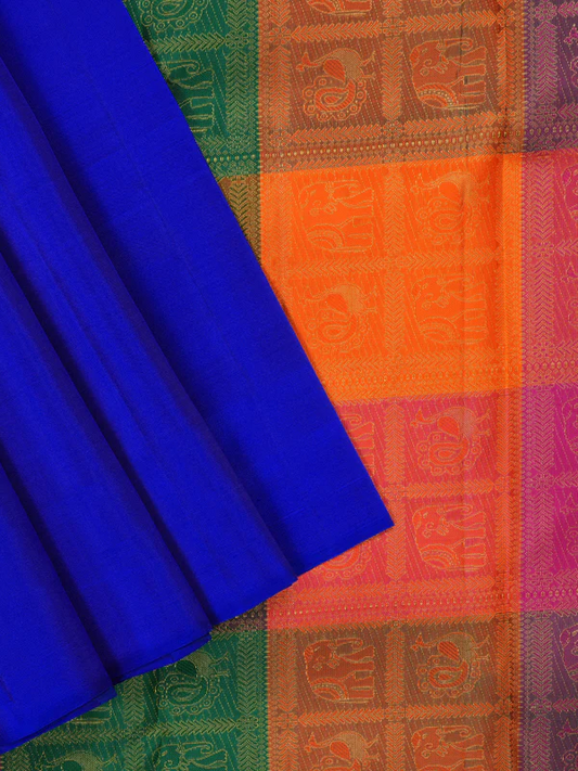 Pure kanchipuram silk saree blue and dual shade of pinkish orange with zari woven box type buttas and zari woven border