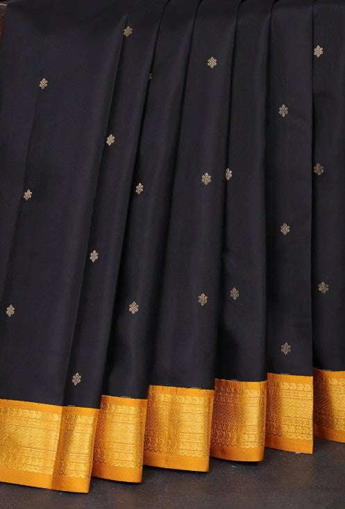 Pure kanchipuram silk saree black and dark mustard with zari woven buttas and zari woven korvai border