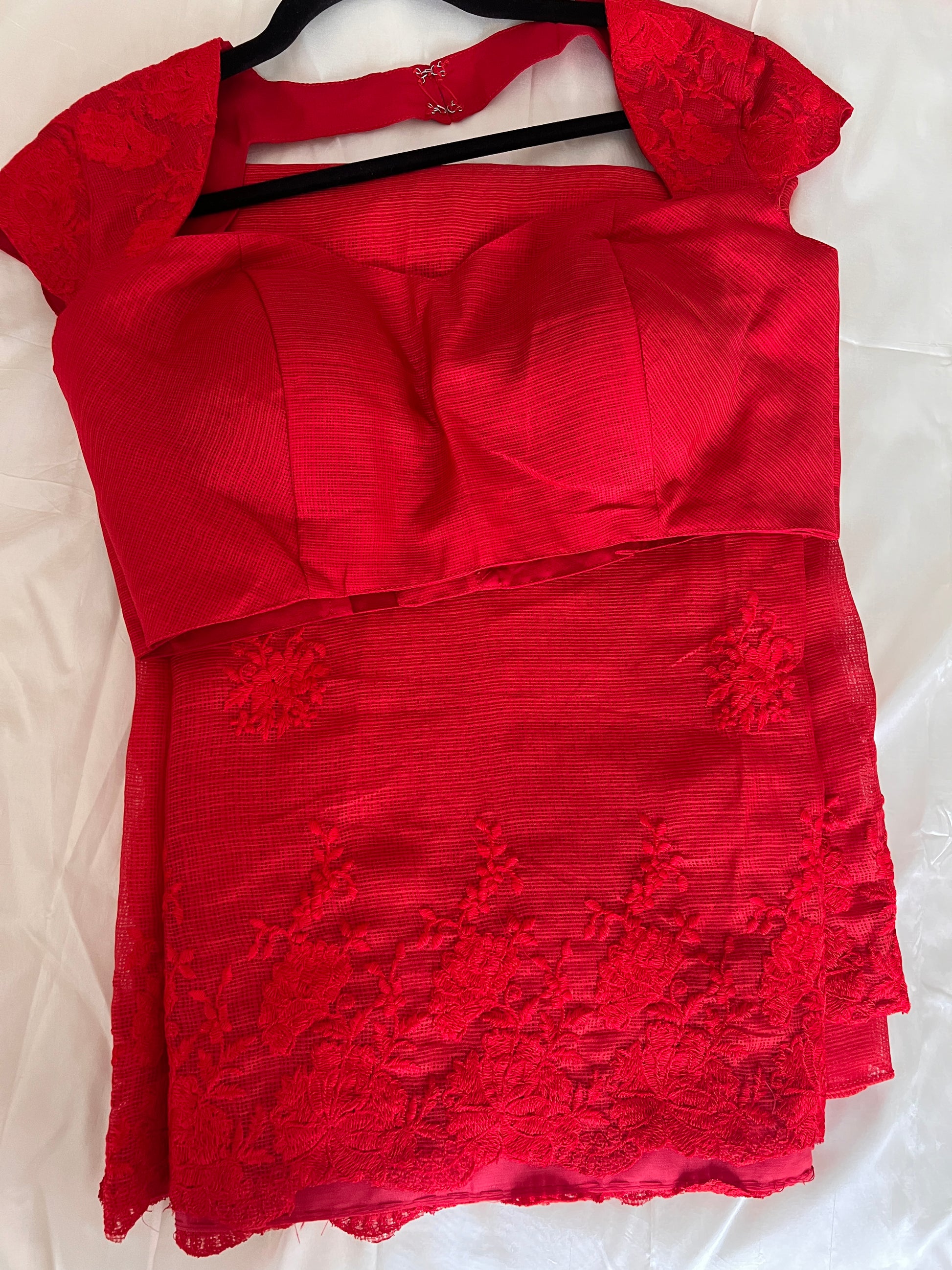 Red Color Kota fabric Saree with Embroidery Work with Stitched Blouse- Size-38